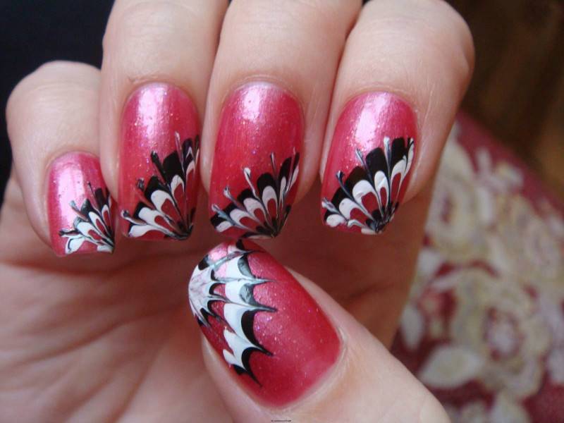 Этот маникюр чем-то напоминает предыдущий, но все же различия есть. Возьмите три лака: основу любого цвета, белый и черный лак. Затем нанесите на ноготь основной цвет и, не дав ему высохнуть, сбоку полукругом нанесите чередующиеся кружочки черным и белым лаком. После этого возьмите иголку и проведите ей от основания ногтя к противоположной стороне полоски, которая соединит эти кружки. Вот так несложно вы можете сделать красивый маникюр. После этого нанесите закрепитель, и он сохранится на ногтях несколько дней.