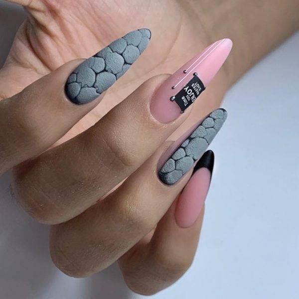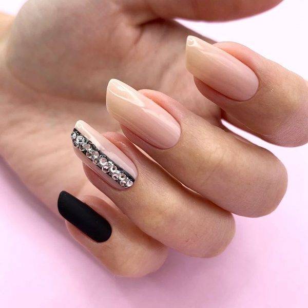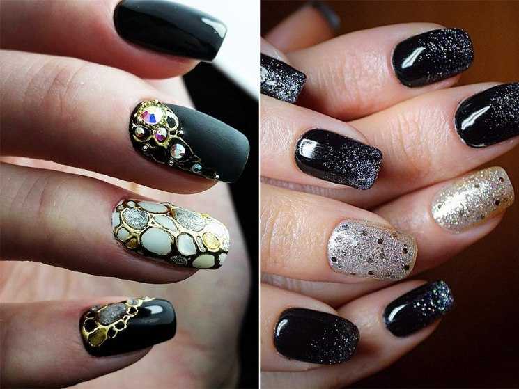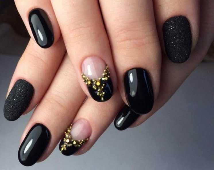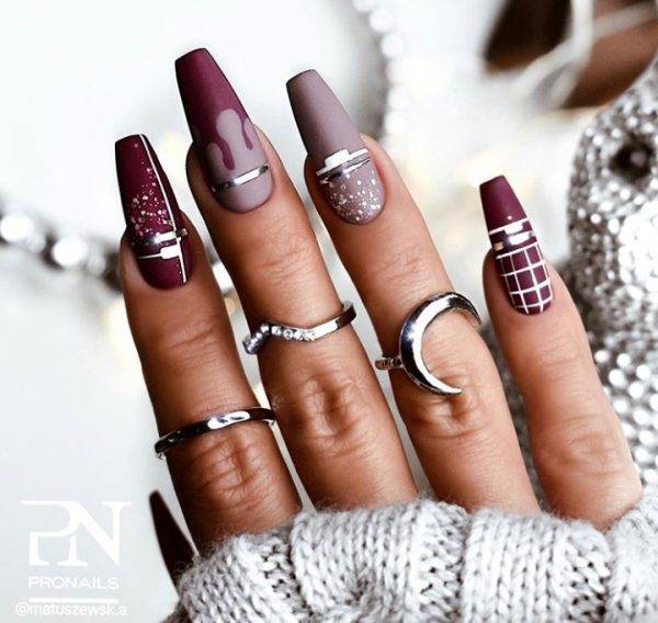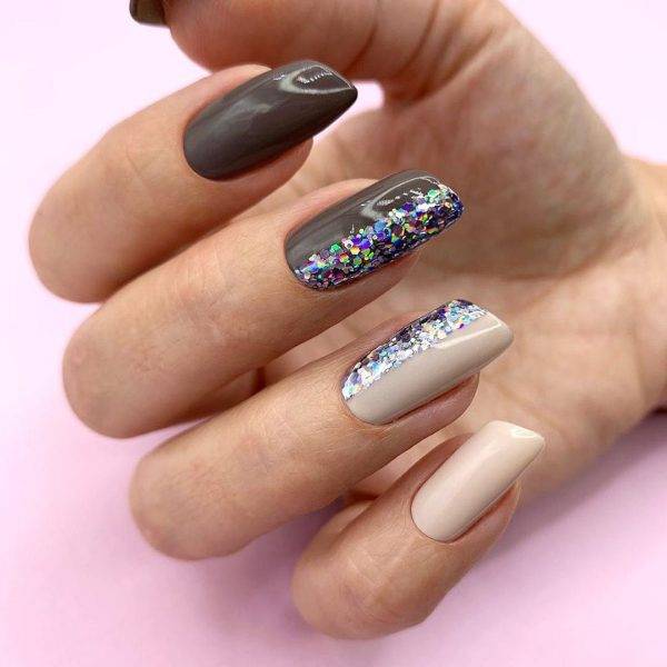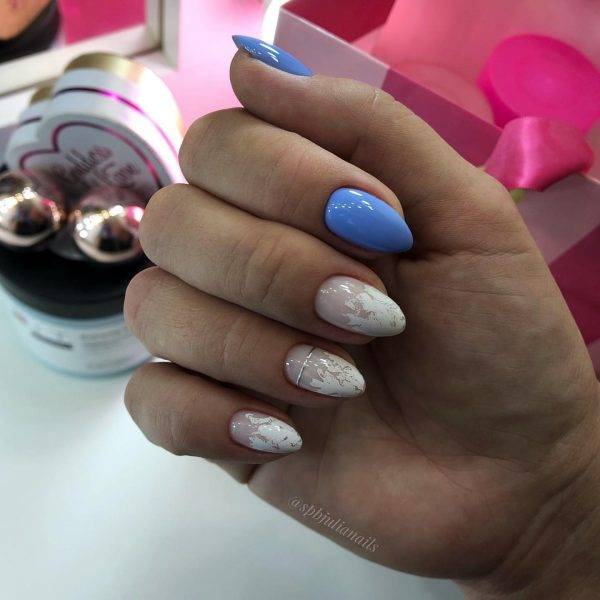 Смешение техник – отличное решение, если хочется выделиться из общей массы. Самые простые комбинации – поталь или втирка и матовая фактура. На бархатистой основе без глянца также отлично смотрится паутинка, стемпинг и наклейки, градиентные переливы и половинки. Также смешение техник возможно в других сочетаниях. Самый просто вариант – разное оформление для каждой из рук. Например, можно комбинировать нюд и мраморность, яркие и пастельные тона. Фольга на гладком классическом покрытии тоже выглядит очень эффектно.