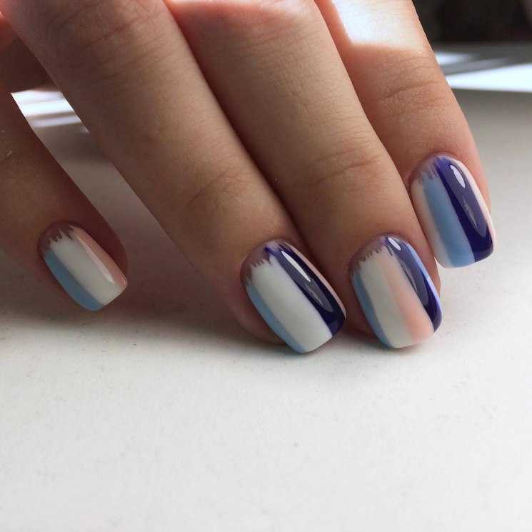 На длинные и короткие ногти маникюр весной и летом этого года делают уже не в морском стиле, а в форме ярких полосок. Их можно расположить вертикально, горизонтально и по диагонали, сделать разной ширины и длины. Хорошо смотрится полосатый маникюр в пастельных тонах, а также яркий сине-бело-голубой, лимонно-зеленый, малиново-белый.