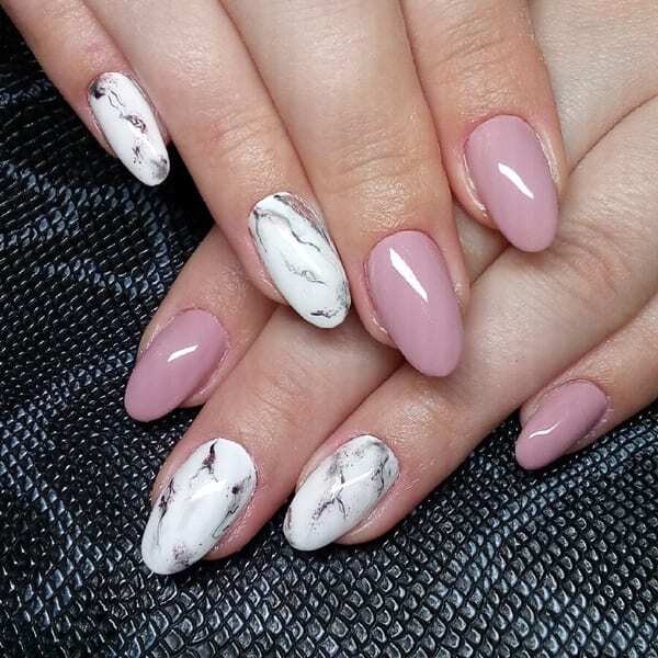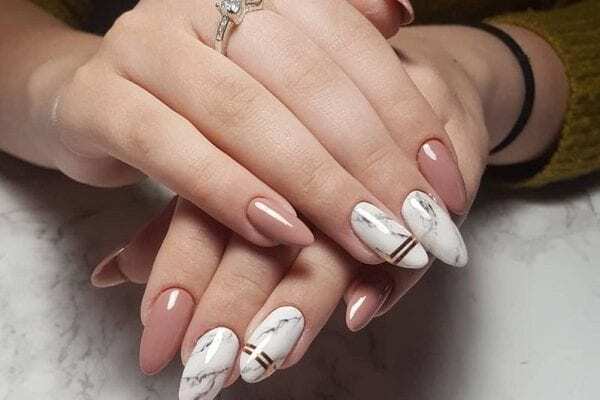 Мраморный. Среди всевозможных вариантов дизайнов ногтей хочется выделить и еще один, который любят богатые и успешные женщины. И это мраморный маникюр. Обычно девушки останавливаются на самом лаконичном его варианте – светло-серые мазки на фоне белого лака. Мрамор обязательно нужно делать в натуральных цветах, чтобы получить желаемый эффект.