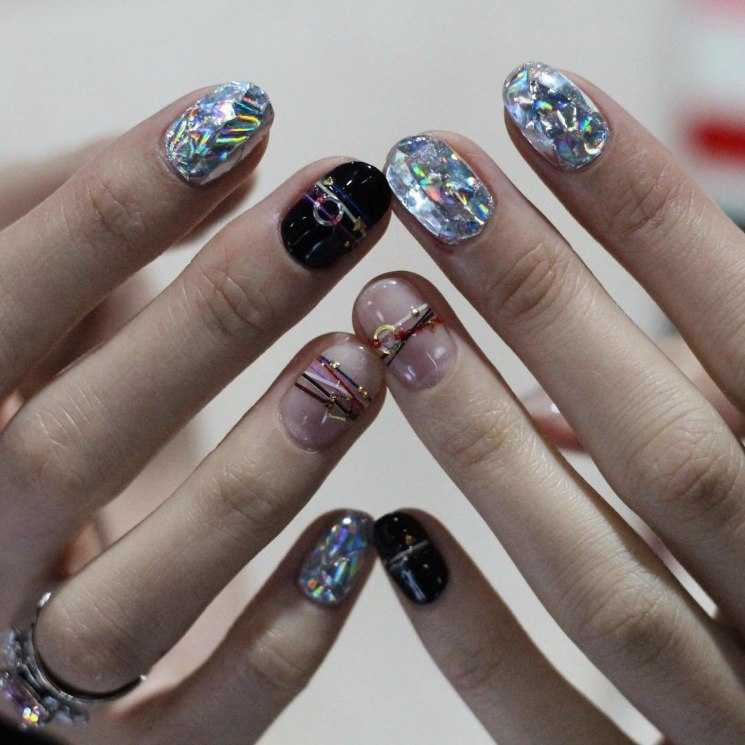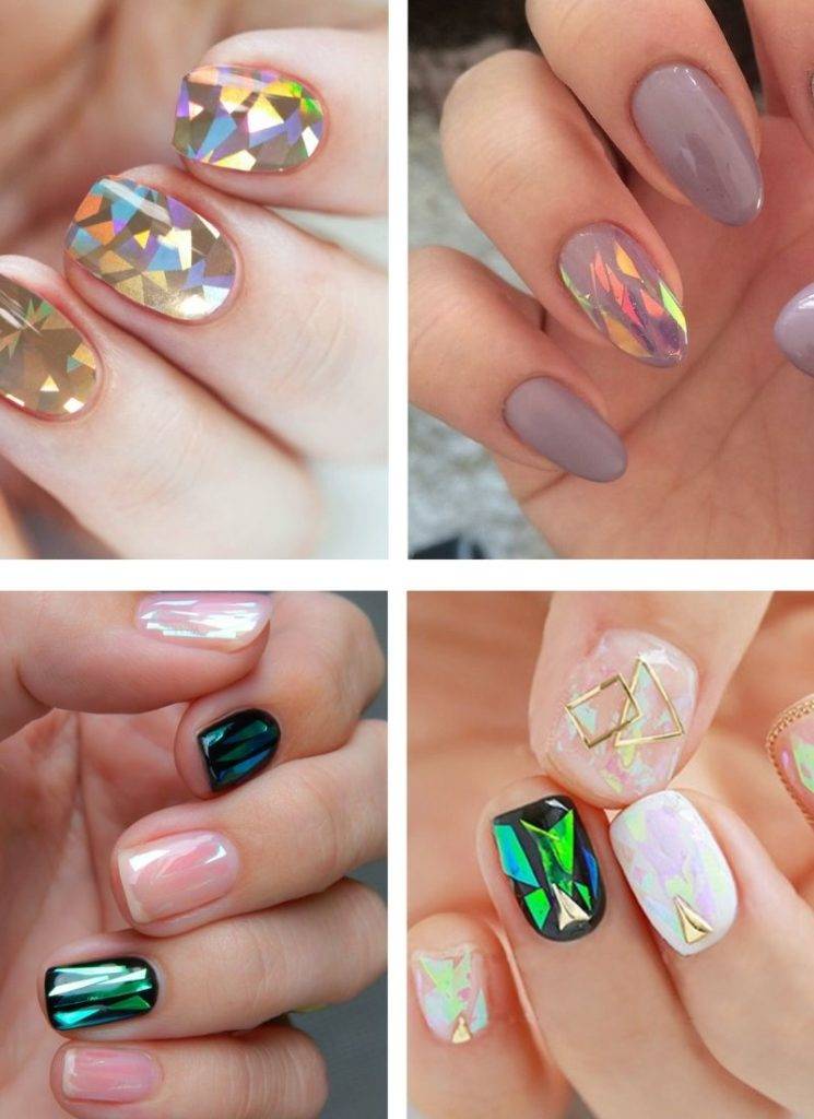 Самая модная техника сезона весна-лето – голографический маникюр с эффектом битого стекла. Для его создания используется как специальная фольга, так и готовые наклейки. Базу под маникюр лучше брать белую или черную, телесную. Но можно выполнить декор и на цветной основе. В технике битое стекло оформляют 1 ноготь или все сразу. Дополнить голографический декор можно полосками и паутинками, рисунками, геометрическими элементами.