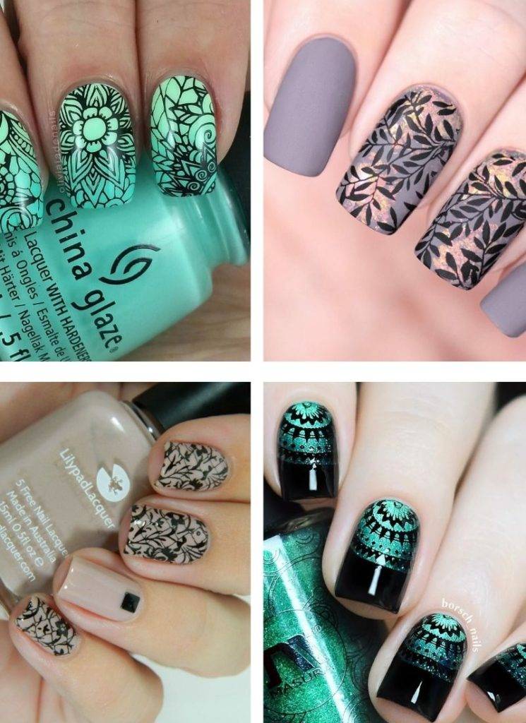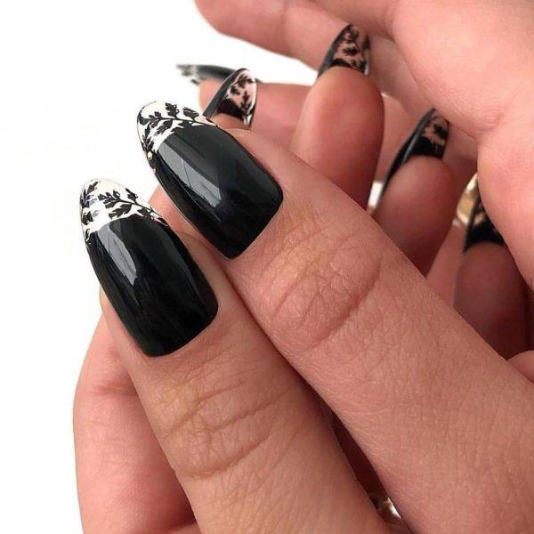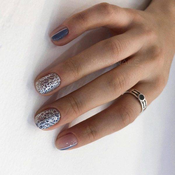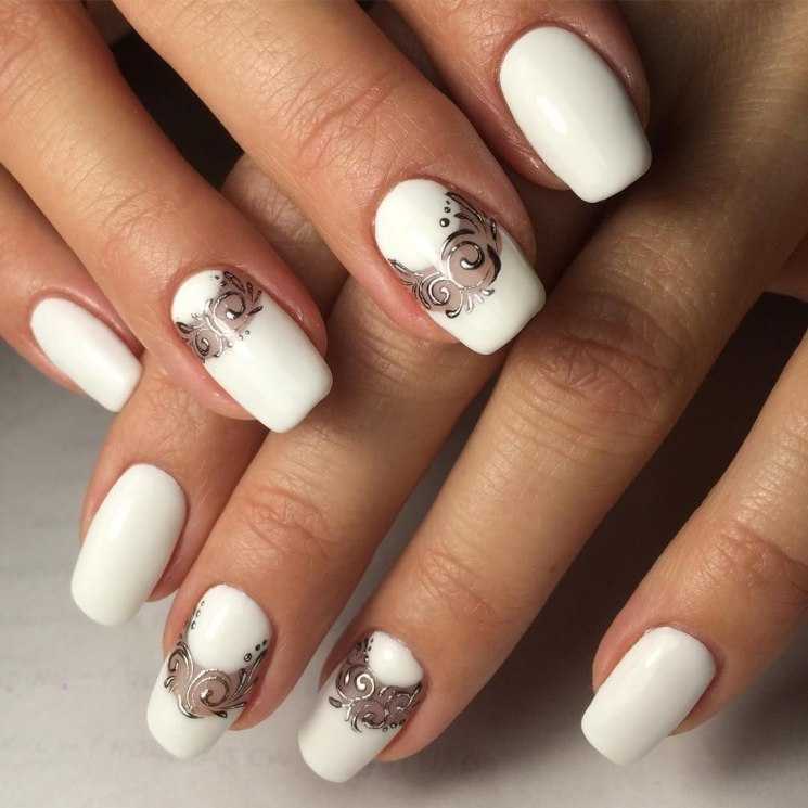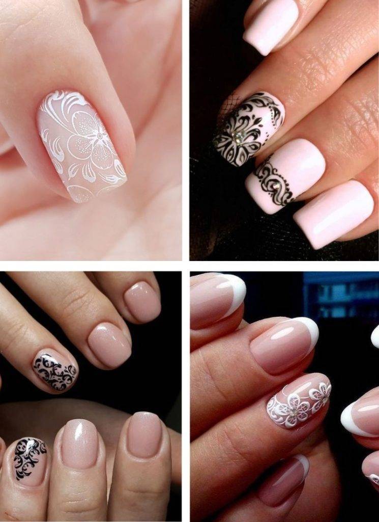 Нежный орнамент, выполненный белым или черным лаком в кружевной технике особенно хорошо смотрится на нюдовом фоне. Но он будет уместен и в более ярком исполнении. А для минималистичности декор делают миниатюрным, всего на 1 ногте или его незначительной части.