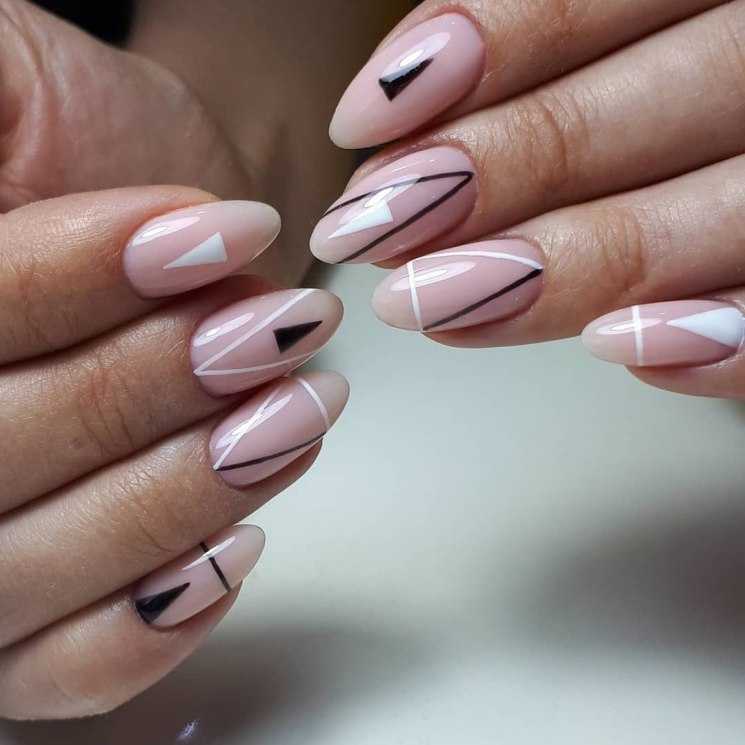 Маникюр весной 2023 предполагает использование художественных навыков мастера на все 100%. Геометрические и абстрактные узоры, деликатная графика. Ими можно украсить все ногти сразу или сделать акцент на одном-двух. Цветовая гамма может быть и яркой, и нейтральной. Среди геометрических узоров в тренде точки, треугольники, квадраты в квадратах.