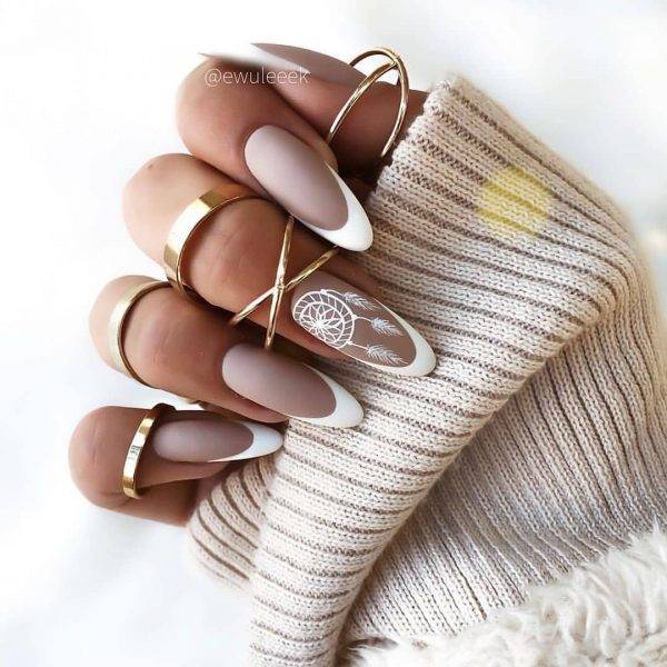 Тенденция выделения одного ногтя прижилась и в других видах модного маникюра 2021-2022. Речь идет о маникюре со стразами и рисунками, французском, лунном, матовом маникюре.