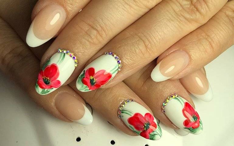 Цветочный нейл-арт можно смело дополнять контрастными виньетками, геометрией, паутинками и сеточками. Декорировать стразами, жемчужинами и бульонками.