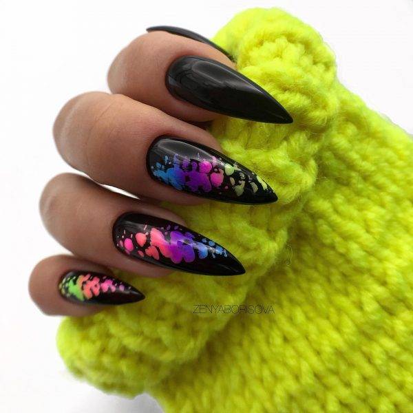 Неоновый дизайн подходит для любых форм и размеров ногтевых пластин, замечательно дополняет оригинальные, экстравагантные образы. Допустимо как однотонное покрытие, так и использование различных техник, дополнение в виде рисунков, блесток, страз.