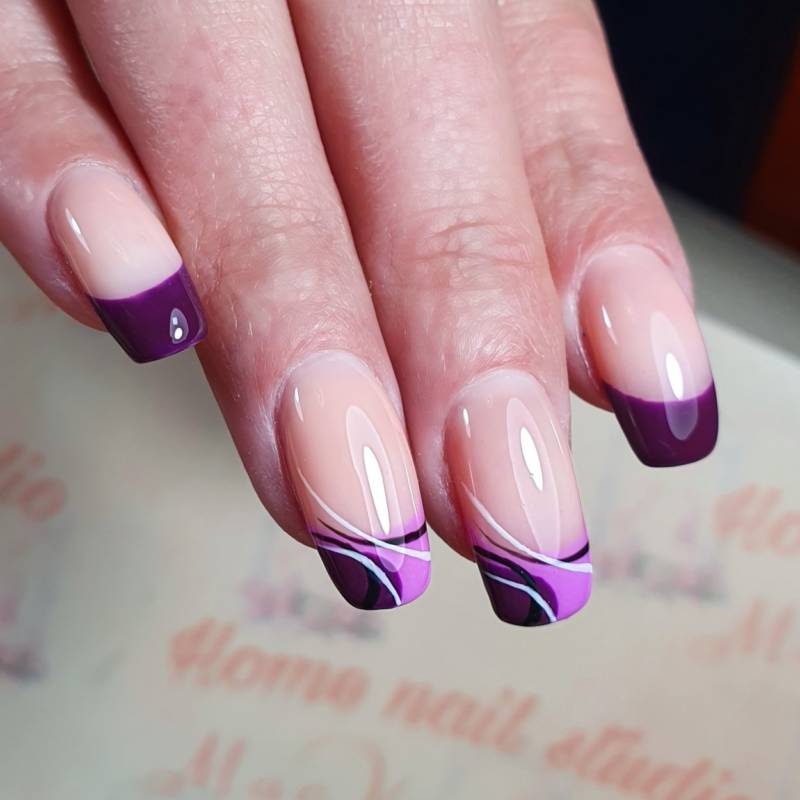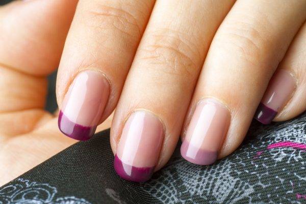 - Нестандартное решение — френч с «улыбкой» разных оттенков на каждом пальце, дублируется на обе руки.