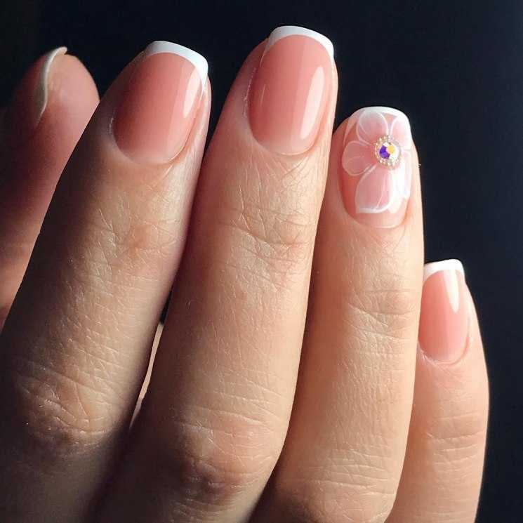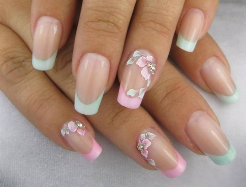 - Френч с флористическими мотивами. Этот тренд согласуется с модными расцветками одежды, особенно актуален такой нейл-арт для теплого периода года.