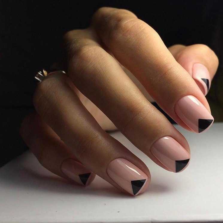 Строгий и очень стильный маникюр на форму мягкий квадрат можно сделать, если использовать черный густой цвет. Кстати, очень стильно и нежно он смотрится в матовом исполнении. Если боитесь, что маникюр будет смотреться очень мрачно, разбавьте царство черного нюдовыми или другими оттенками.