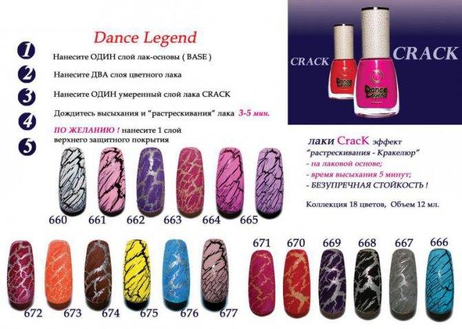 Такой лак чаще всего бывает темного цвета и поступает в продажу в наборе с основой, обычно, блестящей. Однако такое покрытие, если оно достаточно качественное, должно давать ожидаемый эффект на любой лакированной поверхности, даже при нанесении просто на защитную основу. Если качество низкое, то по мере растрескивания он будет повреждать и фоновое покрытие, как бы «утягивая» его за собой. С лаками бренда Dance Legend этого не происходит.