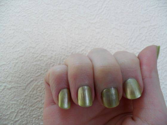 Этот лак из другой серии и этот лак меня разочаровал, ему оценка будет 2!!! Во первых уже сам цвет (называется “Лайм”), в каталоге он смотрелся поинтереснее и совсем другим, нежели оказался в жизни (но с каталожной косметикой часто такое бывает, так что я не удивлена). В жизни это колхозный перламутровый цвет какого то непонятно цвета, даже описать этот цвет сложно- невнятный бледно зелено салатовый + ужасный перламутр. На ногтях полосит, кое где запузырился, очень густой. Из кисточки торчат ворсинки. Сохнет 5-10 минут. Держится 2 дня. Как мне понравился первый лак, так же не понравился этот.