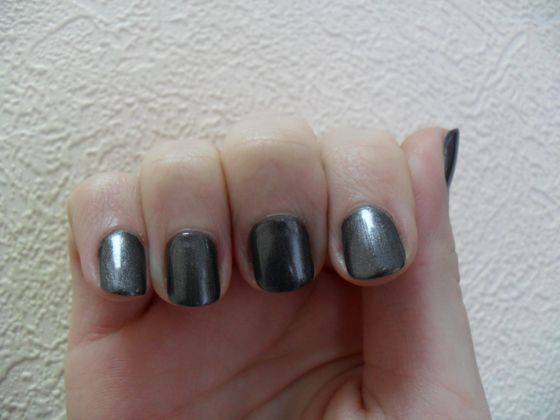 В каждой серии цвета у них еще разделяются на эффекты, этот цвет называется ” Графит” и идет с эффектом ” металлик”. Мое увлечение в последнее время темными лаками дало знать о себе и при выборе этого цвета. Цвет насыщенный серый, ни в коем случае не черный, цвет мокрого асфальта. С мелким шиммером, заметным на солнце. Цвет мне нравится, он не банальный, к подходящему настроению. Качество лака меня удивило, оно отличное! Кисточка обычная, но удобная, ворсинки все как одна- ровненькие. Ложится хорошо и ровным слоем, не полосит и не пузыриться. Сохнет минут 6, максимум 10. Держится дня 2-3, больше не нужно, да на моих ногтях дольше и не бывает.