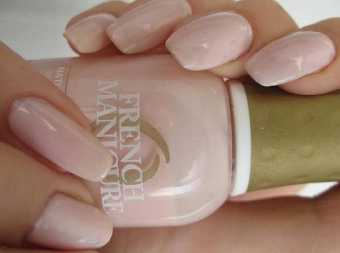 - французский маникюр – декорирование отросшей части ногтя белым цветом, остальной части ногтевой пластины – нежными бежево-розовыми тонами;