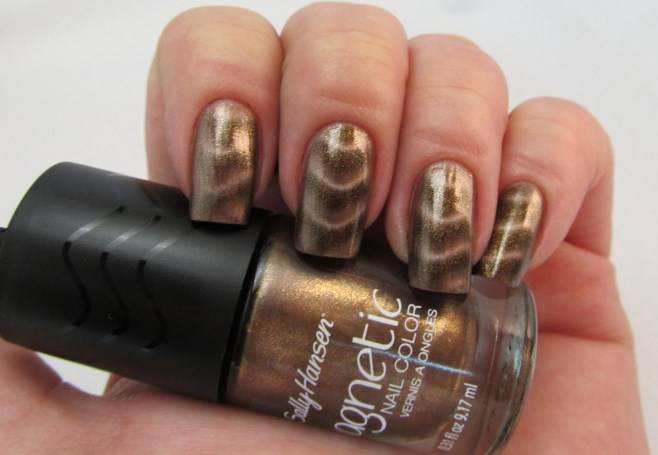 Обратите внимание на магнит, который обычно встроен в колпачок лака. Вы увидите полоски металла, которые создают изображения, такие как параллельные линии, звезды, кривые и т.д