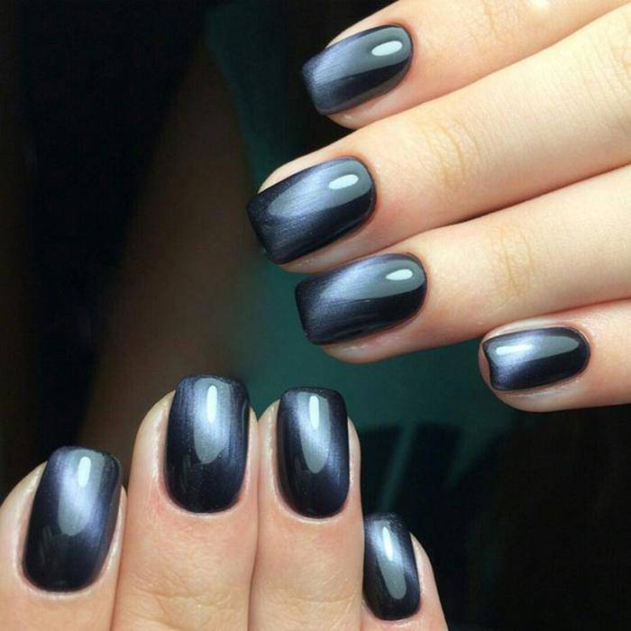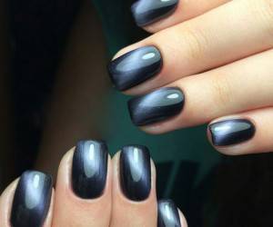 На фото приведен пример именно классического маникюра в этом стиле. Специальный магнит распределяет металлические частички так, что образуется интересный оттенок из одного базового цвета. Добиться такого же эффекта без магнита невозможно.