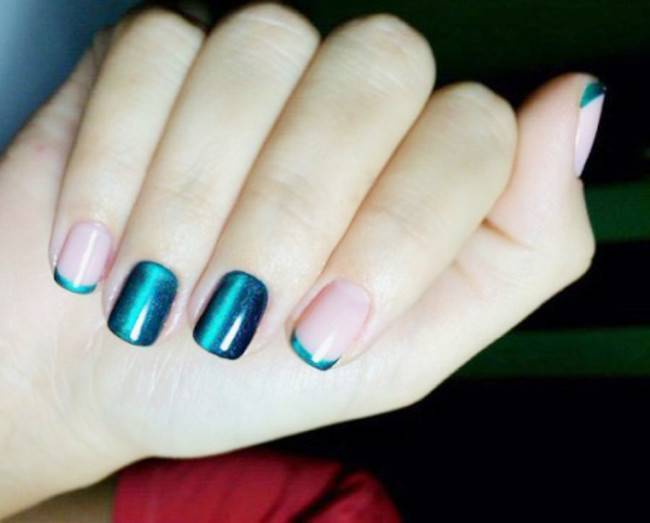 Нередко мастера предлагают совмещение технологий. Например, тигровый маникюр с лунным нейл-артом. Или фан-френч с магнитным гель-лаком и кошачьей технологией. Нередко мастера совмещают именно французский маникюр с магнитной.