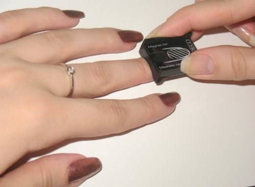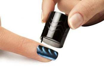 - , как правило, поставляется с лаком для ногтей без дополнительной оплаты. Но если вам не нравится узор на нем, то можно выбрать магнит с необычным рисунком «по душе» в специализированном маникюрном магазине (или онлайн-магазине). Цена — от 70 рублей. Использовать магнит очень просто: нужно поднести его к ногтю на расстоянии 3-5 мм и подождать 10-20 секунд до появления на лаке рисунка.