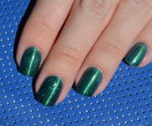 Сначала ноготки покрывают основой (базой) для гель-лака, которую просушивают в ультрафиолетовой лампе. Затем наносят зеленый гель-лак, который тоже сушат. Магнит подносить сразу не нужно. В видео мастер этот момент описывает. На фото показан прекрасный, глубокий изумрудный оттенок, который очень похож на кошачий глаз.