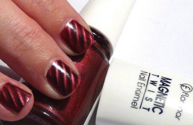 Магнитный маникюр – недавняя новинка, ставшая классикой. Лак с магнитом дает возможность создавать на ногтях причудливые узоры даже тем, кто совершенно не умеет рисовать. Звезды, полосы, волны и зигзаги создаются при помощи мельчайших металлических частиц, входящих в состав средства. Выбор орнамента зависит от магнита. Магнитный лак для ногтей носят самостоятельно или сочетают с обычными эмалями, выделяя им лишь несколько пальцев.