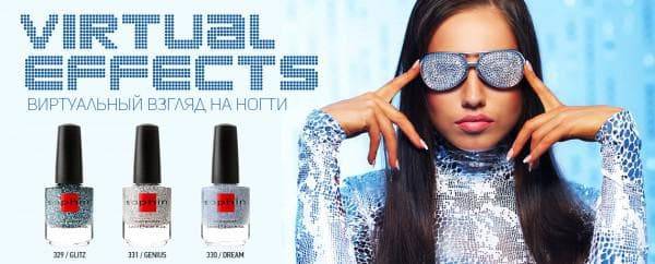 Коллекция VIRTUAL EFFECTS COLLECTION в своем составе имеет 4 базовых цвета. В составе имеется 4 глиттерных цвета. В составе можно обнаружить золотистую слюду разного размера, серебристые голо-квадратики, разноцветный глиттер и серебристые блестки. В результате каждый из лаков будет особенным.