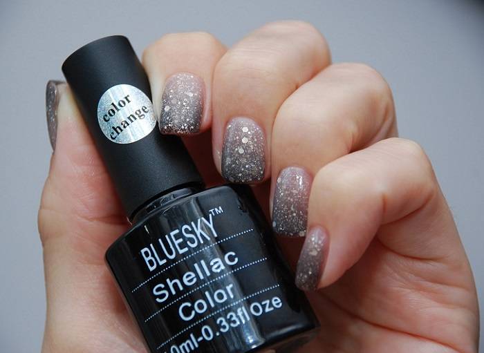 Шеллак, способный изменять окрас, можно найти лишь в магазинах профессиональной косметики. Там такой вид лаков продают примерно по 350 рублей за единицу.