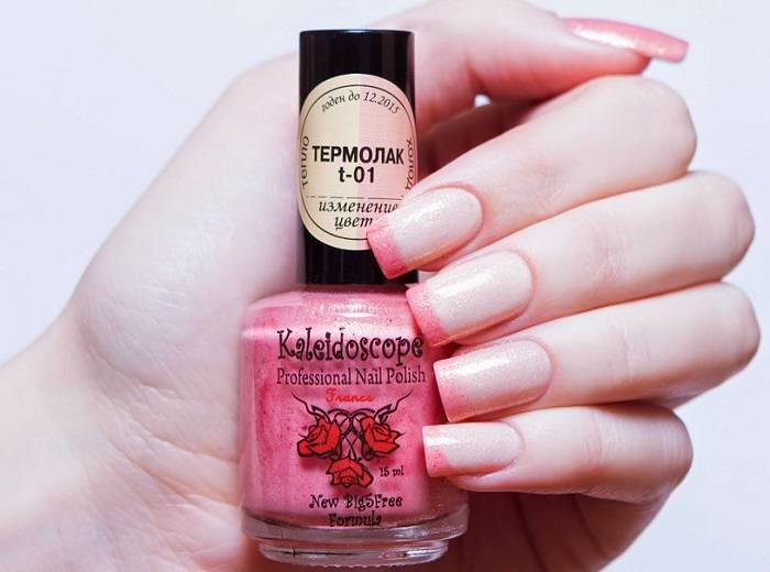 В соответствии с температурой окружающей среды лак меняет свой цвет, как хамелеон, повышает настроение обладательнице таких ногтей и удивляет всех окружающих. Когда вы выходите на улицу, то цвет ногтей один, а в помещении совершенно другой. Такой эффект достигается благодаря использованию в составе активных компонентов, которые реагируют на температуру внешней среды.