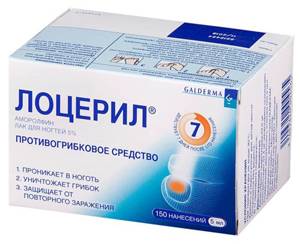 - Лоцерил – противогрибковый лак с активным веществом Аморолфин. Это аналог препарата Офломил. Предназначен для лечения микоза ногтей, когда грибом поражено не больше, чем 2/3 ногтя. Эффективен против разных видов грибов: Candida, Epidermophyton, Cryplococcus, Pityrosporum, Mycrosporum, Alternaria, Hendersonula, Scopjlariopsis, Coccidoides, Cladosporium, Fonseceae, Sporothrix. Наносится 1-2 раза в неделю 6-12 месяцев. Противопоказания – индивидуальная непереносимость, беременность, лактация. Побочные эффекты – зуд и покраснение ногтя. Цена – от 1300 руб. Подробнее о лаке Лоцерил.