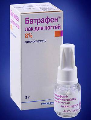 - Батрафен – эффективный лак для лечения 58 видов грибов, провоцирующих развитие микоза на ногтях рук и ног. Его активный компонент – Циклопирокс. Схема терапии рассчитана на 3 месяца. 1-ый месяца средство наносится на поражённые ногти через день, 2-ой месяц – дважды в неделю, 3-ий месяц – раз в неделю. Максимальная длительность терапии – 6 месяцев. Противопоказания – возраст до 10 лет, гиперчувствительность к компонентам, беременность, лактация. Побочные эффекты – крапивницы, зуд, шелушение. Стоимость – от 2200 руб. Подробнее о лаке Батрафен