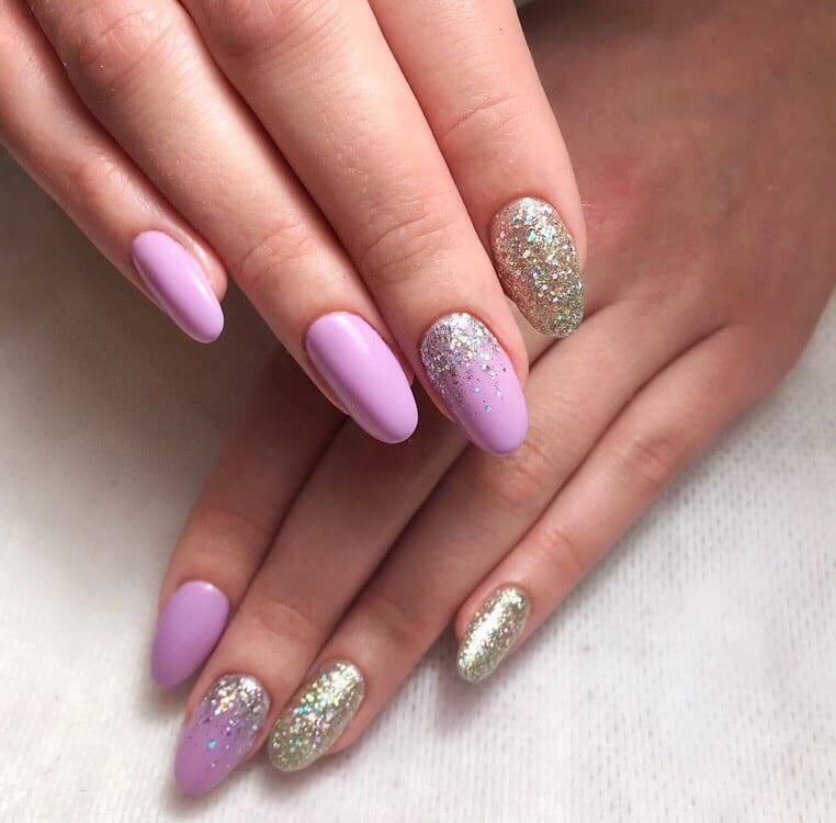 Присутствие золотистого блеска на ноготках добавит маникюру яркий акцент, тем более, если основой нейл-арта является сиреневое покрытие. Для такой золотистой изюминки можно использовать втирку, фольгу, глиттер и т.д. Изящно выглядит на сиреневом фоне литье с переводной фольгой, фольгированные полоски золотистого оттенка, узоры из мелких страз и т.д. На сиреневом фоне эффектно создавать кружевной золотой маникюр или ажурную роспись.
