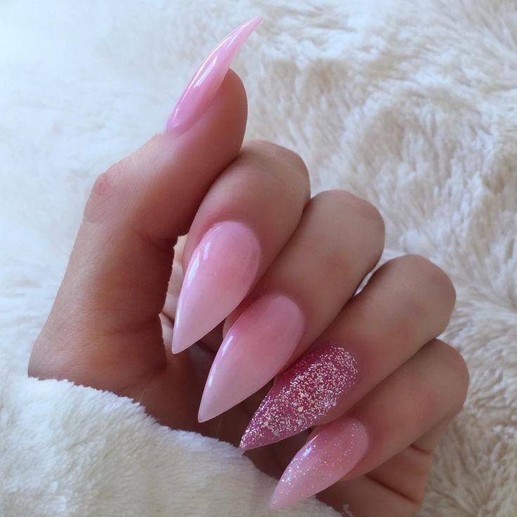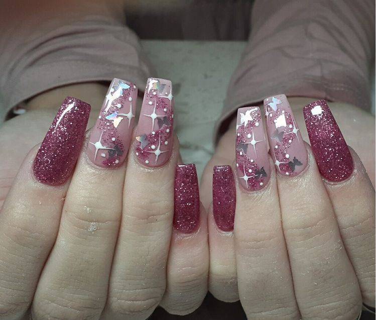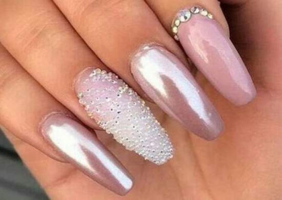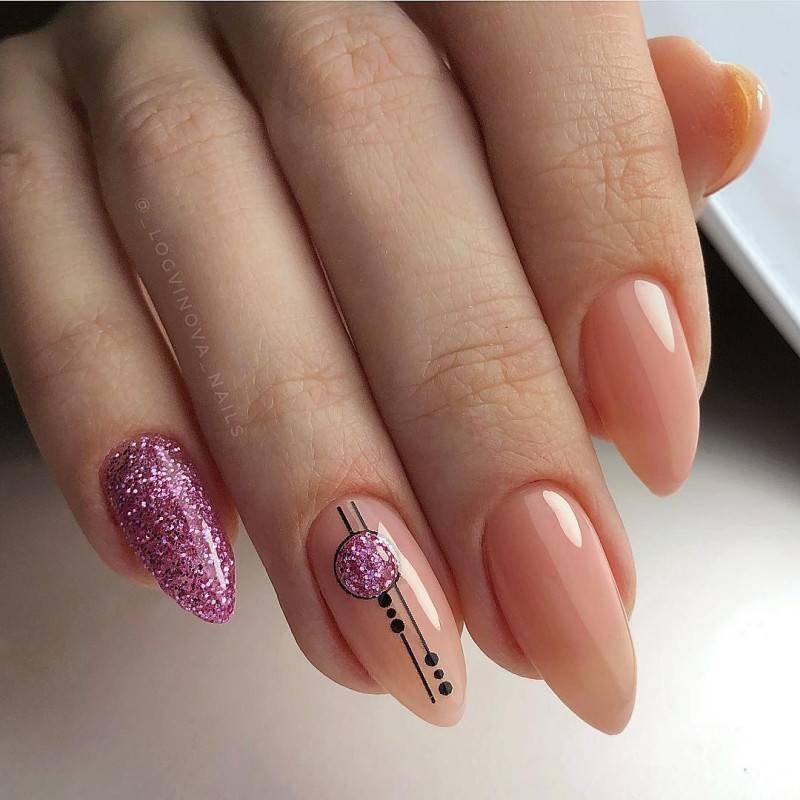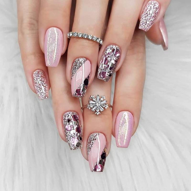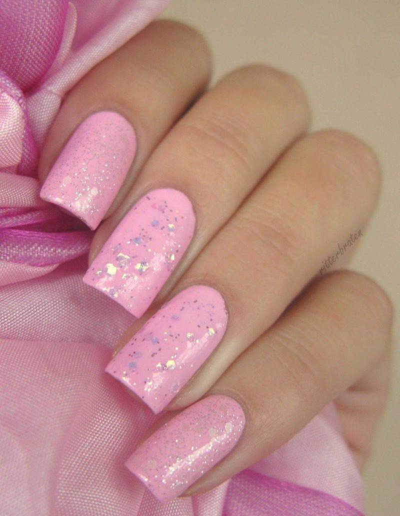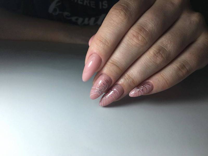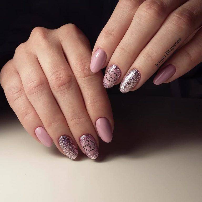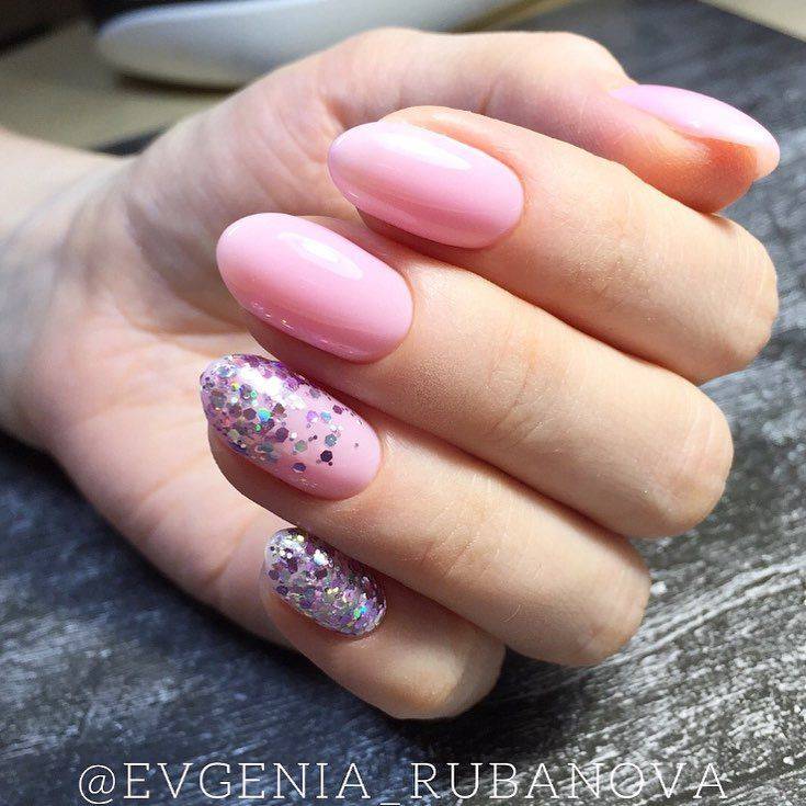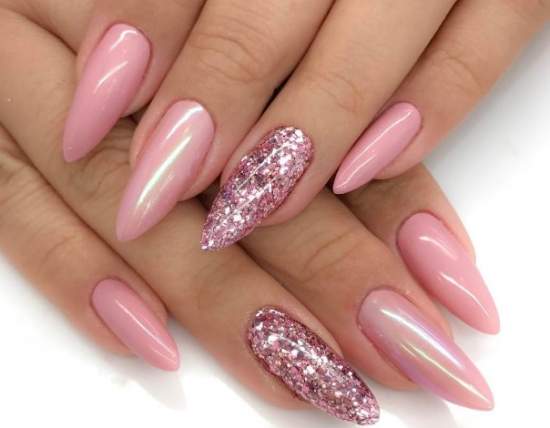 При выполнении маникюра на длинных ноготках всегда можно пофантазировать и воплотить в реальность самые невероятные идеи. При помощи различных блёсток можно создавать на ногтевых пластинах интересные узоры или выделять сиянием лишь часть ногтя. Френч, лунный дизайн и многие другие идеи являются в этом случае наглядным примером. Розовый маникюр с блёстками допускает использование как ярких, так и сдержанных оттенков, а также серого, белого или чёрного лака. Помимо блестящих дополнений также приветствуются рисунки, объёмные детали и комбинирование нескольких техник.