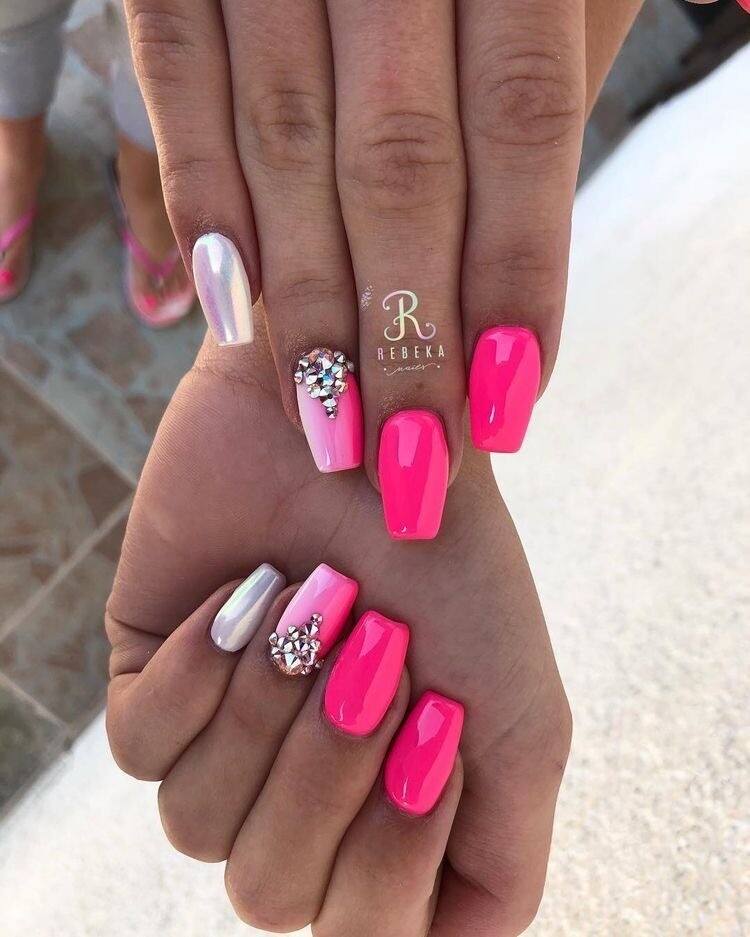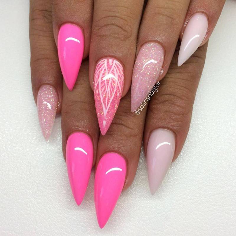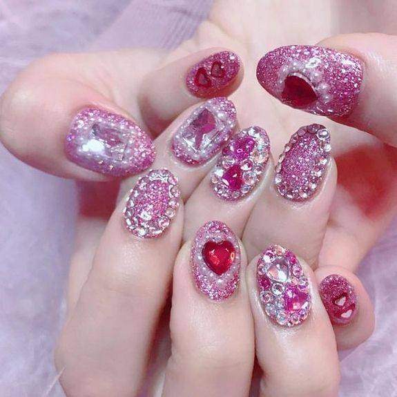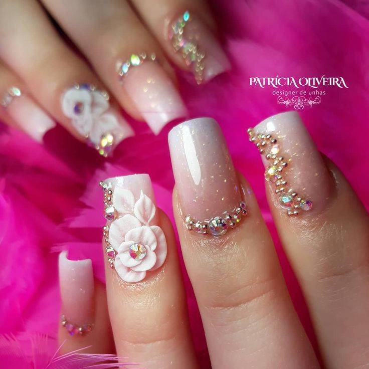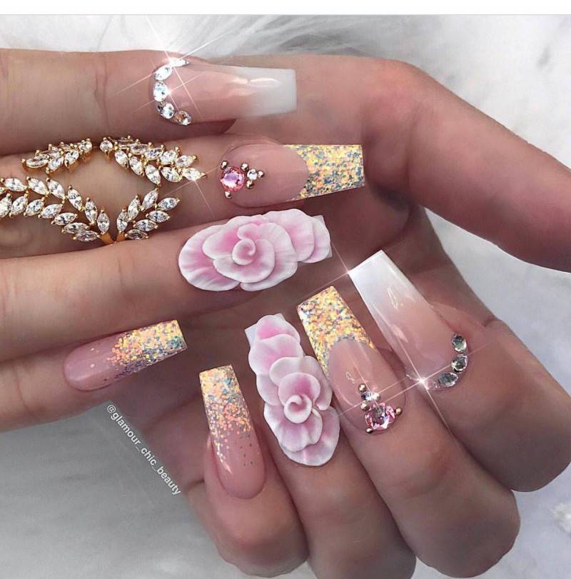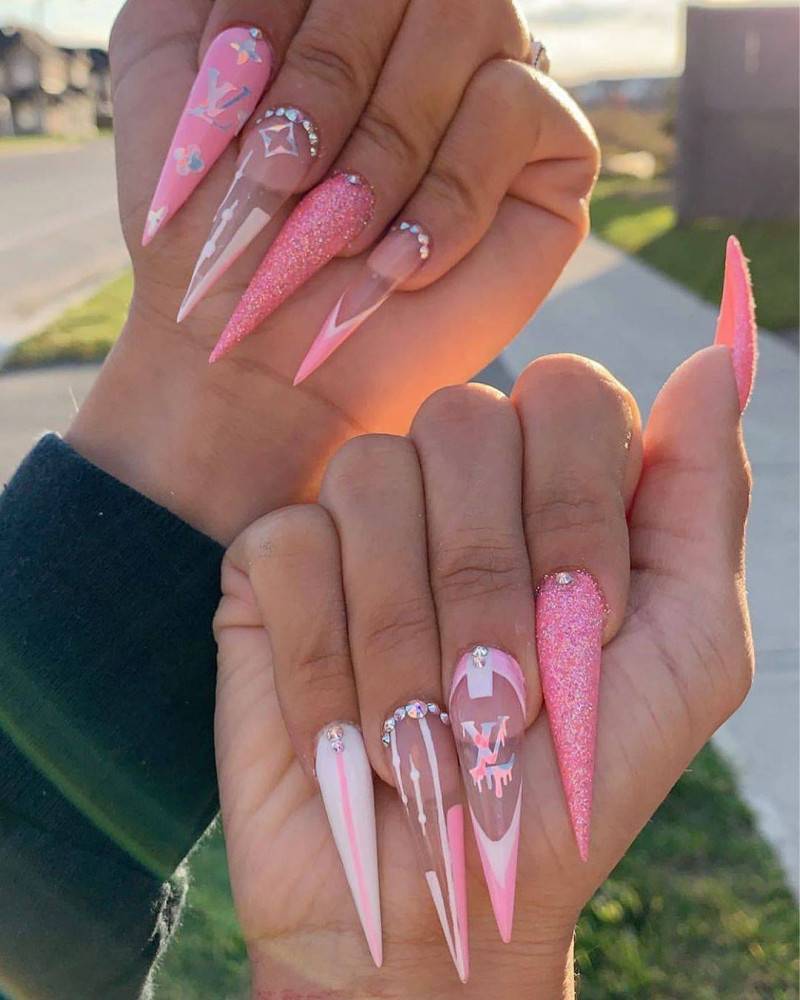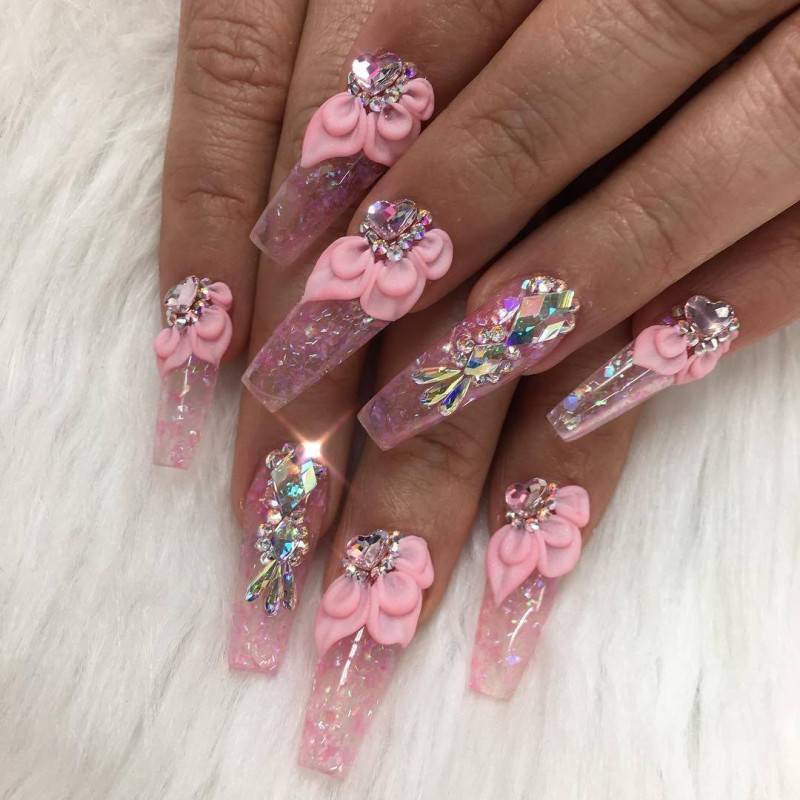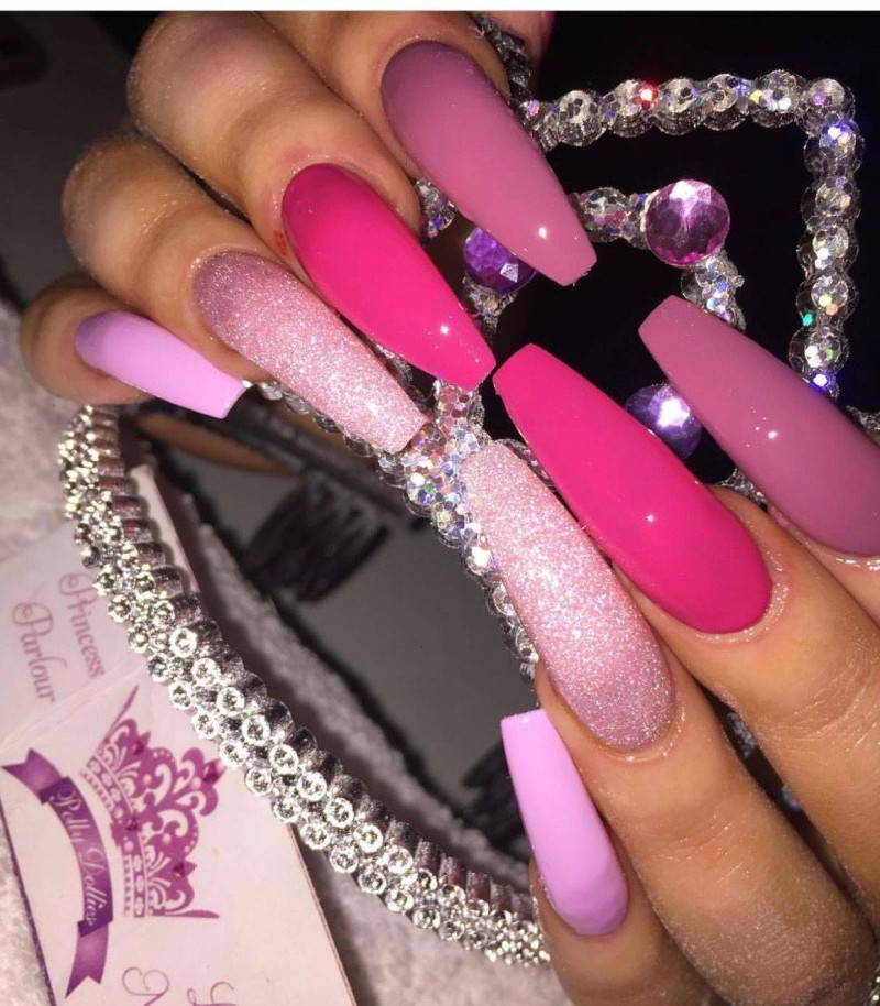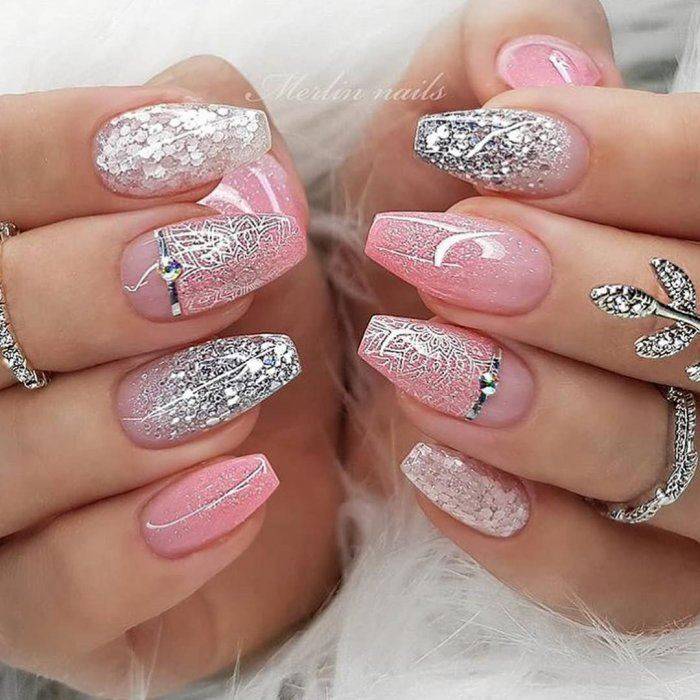 При выполнении маникюра на длинных ноготках всегда можно пофантазировать и воплотить в реальность самые невероятные идеи. При помощи различных блёсток можно создавать на ногтевых пластинах интересные узоры или выделять сиянием лишь часть ногтя. Френч, лунный дизайн и многие другие идеи являются в этом случае наглядным примером. Розовый маникюр с блёстками допускает использование как ярких, так и сдержанных оттенков, а также серого, белого или чёрного лака. Помимо блестящих дополнений также приветствуются рисунки, объёмные детали и комбинирование нескольких техник.