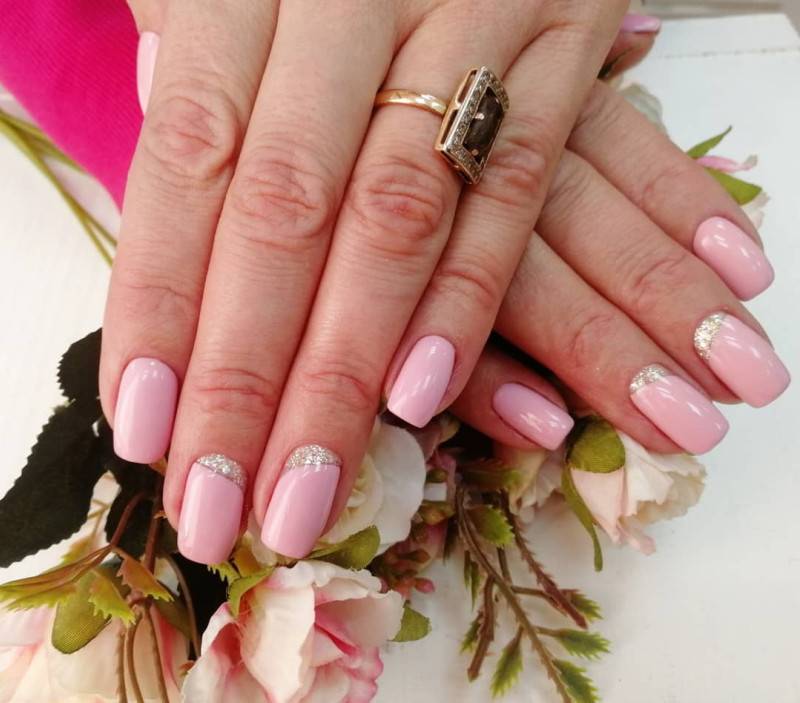 – френч с блесками на кончиках. Именно этот вариант маникюра имеет наибольшую популярность среди перечисленных. А сделать его просто! На розовую или бежевую основу нанесите прозрачным лаком линию улыбки. Опустите ноготь в баночку с блестками. Спустя некоторое время, смахните с пластинки лишние блестки. Покройте ноготь прозрачным финишем, чтобы выровнять покрытие и закрепить результат. Если вы используете блестящий лак, то нанесите на кончик несколько слоев, чтобы сделать декор более выразительным. Концентрация блесток на кончике ногтя должна быть высокая.