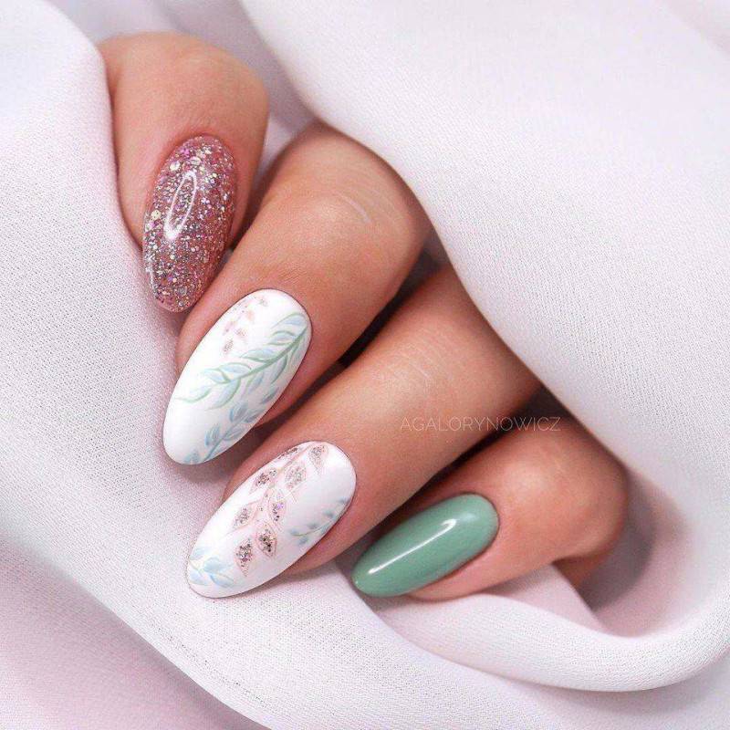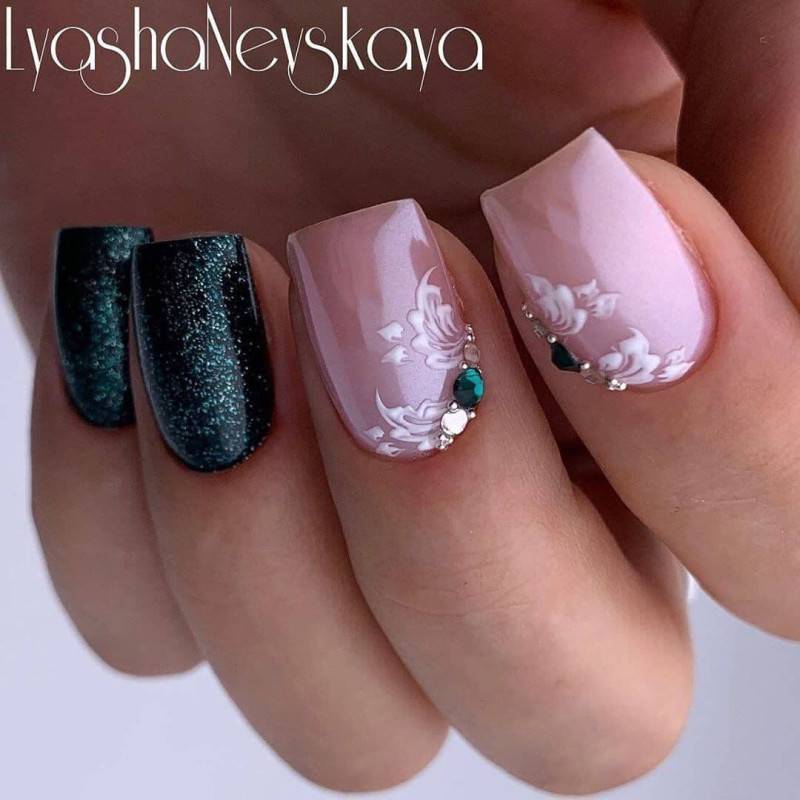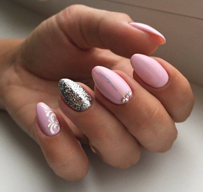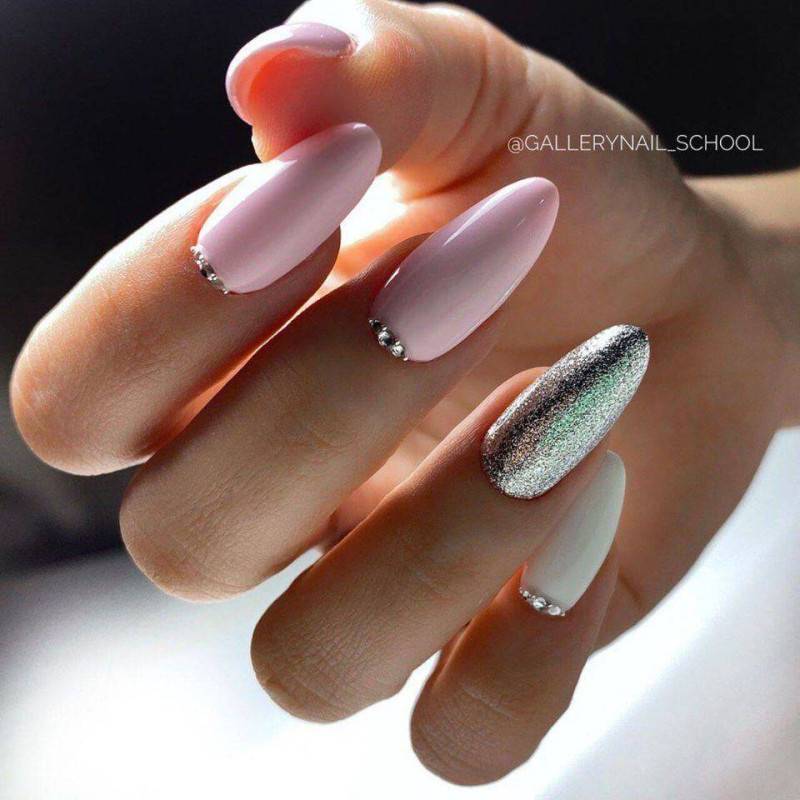 Великолепно смотрится градиентный бело-розовый маникюр, в котором один из ноготков выделен глиттером, мелкими прозрачными бульонками и стразами. Присмотритесь к классическому французскому маникюру, в создании которого как раз участвуют эти оттенки. Блестки при этом можно использовать для выделения края ногтя или отвести под блестящий декор какой-нибудь из ноготков.