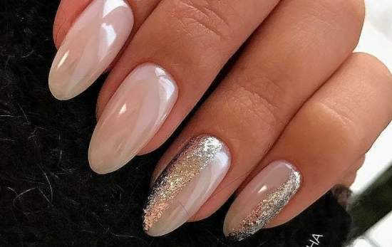 - Маникюр по фэн-шуй. Предполагает акцент на безымянном пальце, при этом цвет блесток может совпадать с основой или контрастировать с ней.