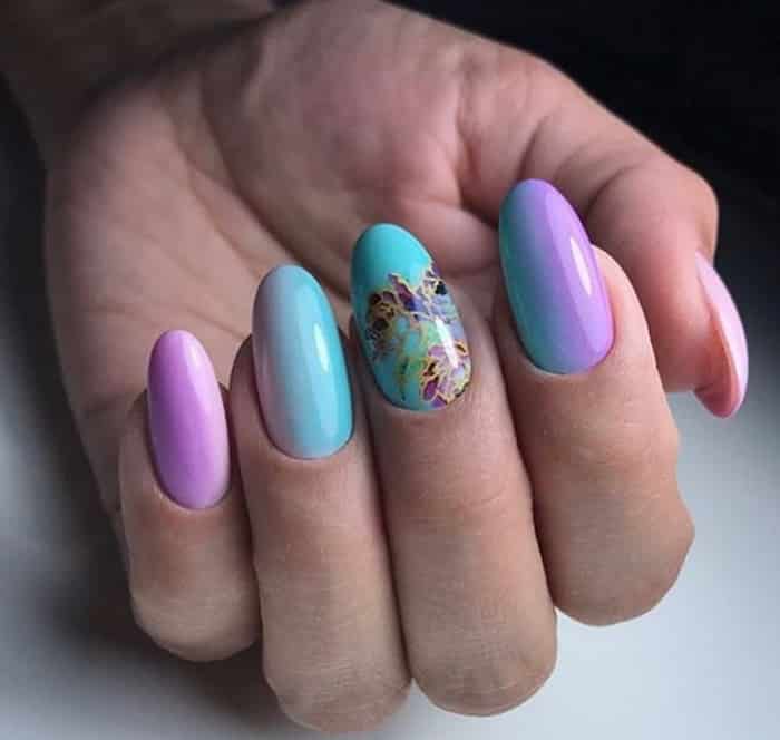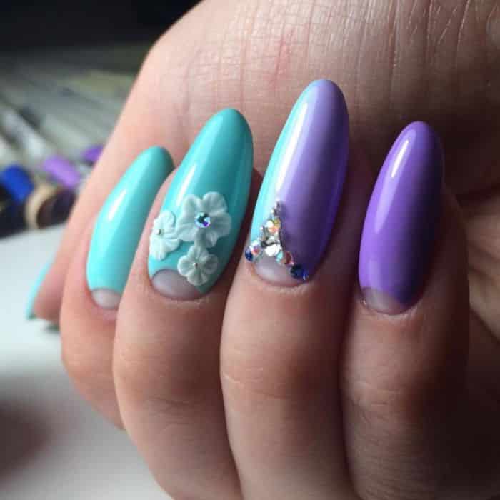 Завораживающая бирюза вместе с сиреневым лаком смотрится очень гармонично и при этом романтично. Модный тандем этих оттенков можно использовать для весеннего, летнего маникюра, декорировать, делать комбинации из матового и глянцевого покрытия. Делая нейл-арт с бирюзовым и лиловым оттенком, стоит учитывать соотношение тона. К примеру, не стоит делать дизайн с ярким сиреневым оттенком и нежным пастельным бирюзовым, а лучше подобрать более насыщенный вариант бирюзы.