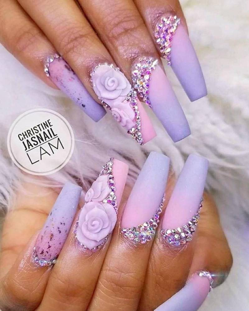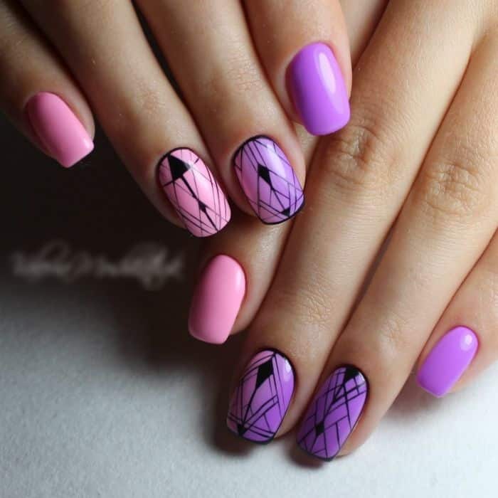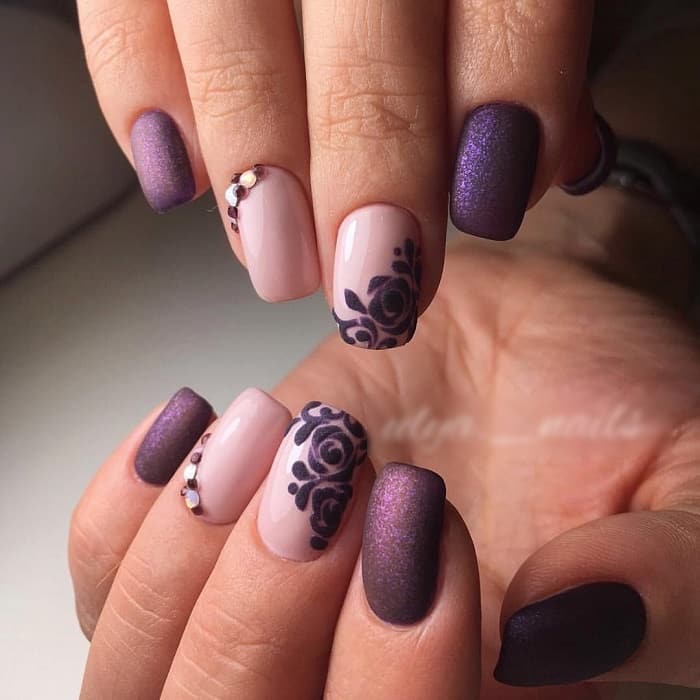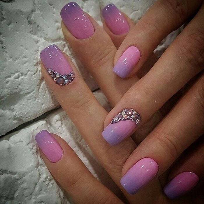 Нежные оттенки сиреневого (лилового) оптимально сочетаются к близким к ним тонам розового. Соответственно насыщенные цвета хорошо сочетаются с такими же яркими вариантами или темными оттенками. Объединятся сиреневый с розовым может в разных техниках маникюра, дополнятся декором аналогичных цветов или яркими элементами под золото, серебро и т.д.