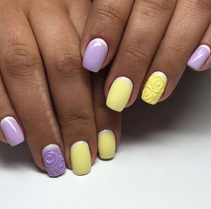 Сделать маникюр ярким и солнечным помогут оранжевые и желтые цвета. Лиловая основа хорошо с ними контрастирует, а сочетая эти оттенки вместе можно получить яркий сочный летний маникюр. При использовании пастельных оттенков и сочетая их в какой-либо технике, нейл-арт получается неброским и аккуратным.