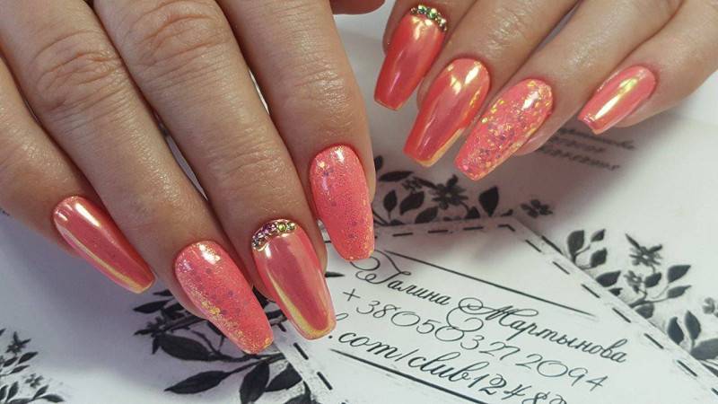 Длинные ногти – это настоящий «холст» для нейл-мастера, на котором можно создать самый замысловатый дизайн. Для него можно использовать разный декор, сочетающийся с блестящими втирками: стразы, бульонки, глиттер, песок, хлопья Юкки, фольгу, роспись.