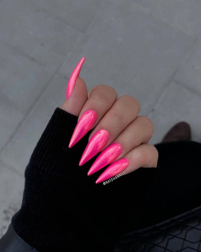 Если в повседневном гардеробе преобладают яркие цвета, можно остановить свой выбор на ярко-розовом маникюре с голографическим эффектом. Он станет главным акцентом образа и подчеркнет смелость и энергичность своей обладательницы.