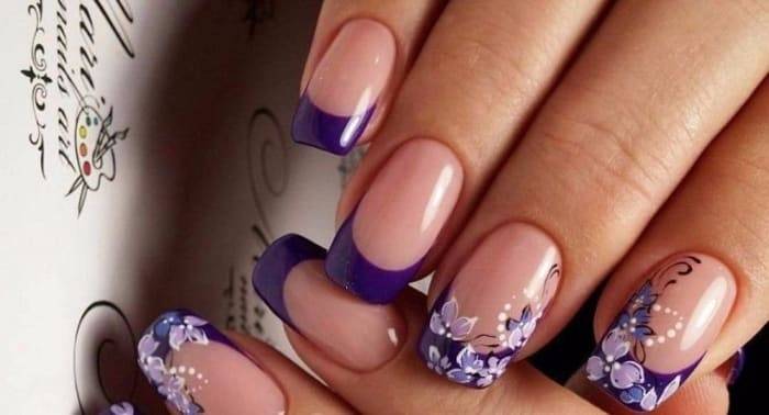 Приглушенные оттенки синего гармонично сочетаются с любым оттенком лилового, яркие тона стоит подбирать аккуратно, чтобы избежать эффекта «забивания» цветов друг другом. Голубые пастельные тона удачно смотрятся с лиловыми оттенками, объединяясь в эффектный геометрический маникюр, френч, точечный дизайн и т.п.