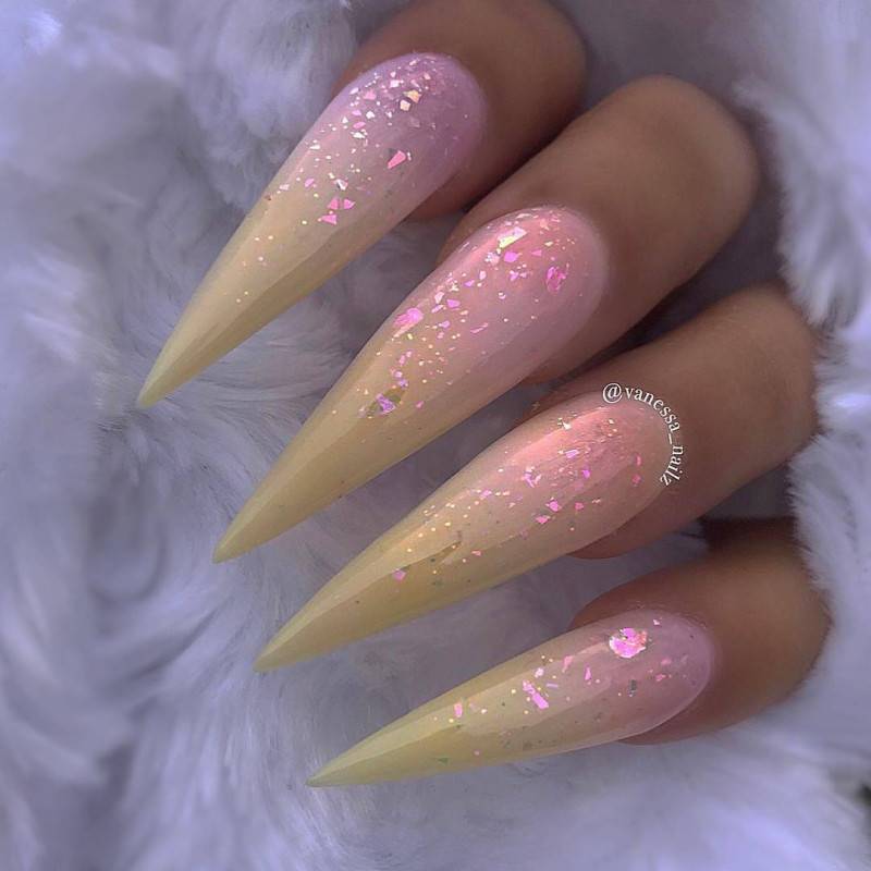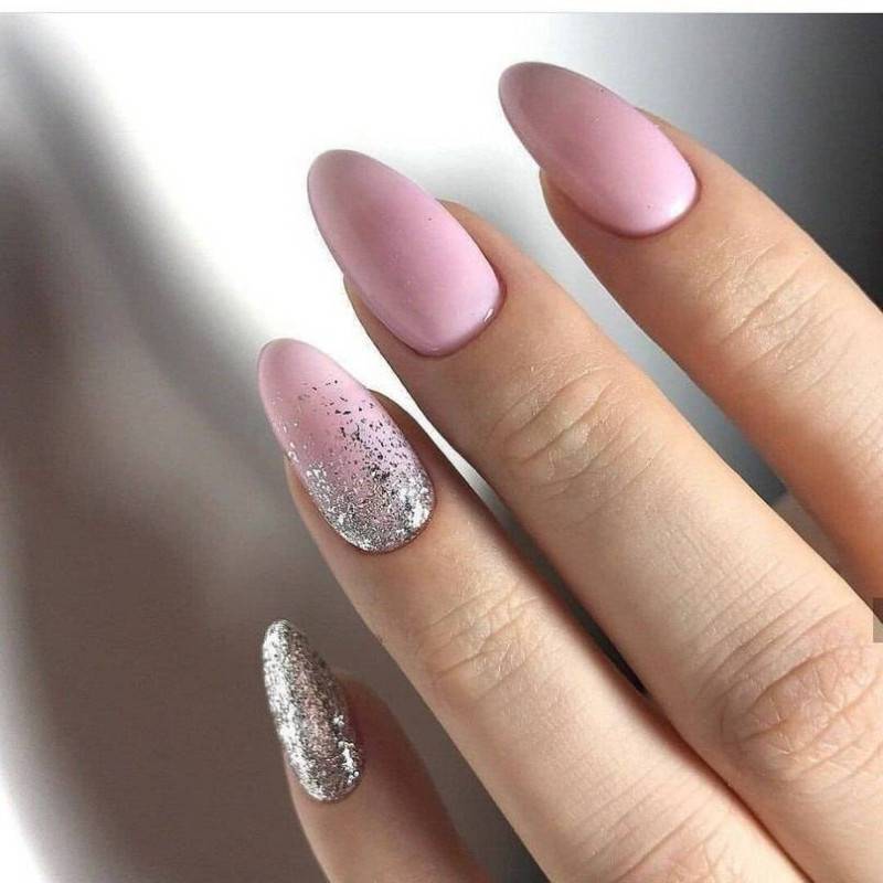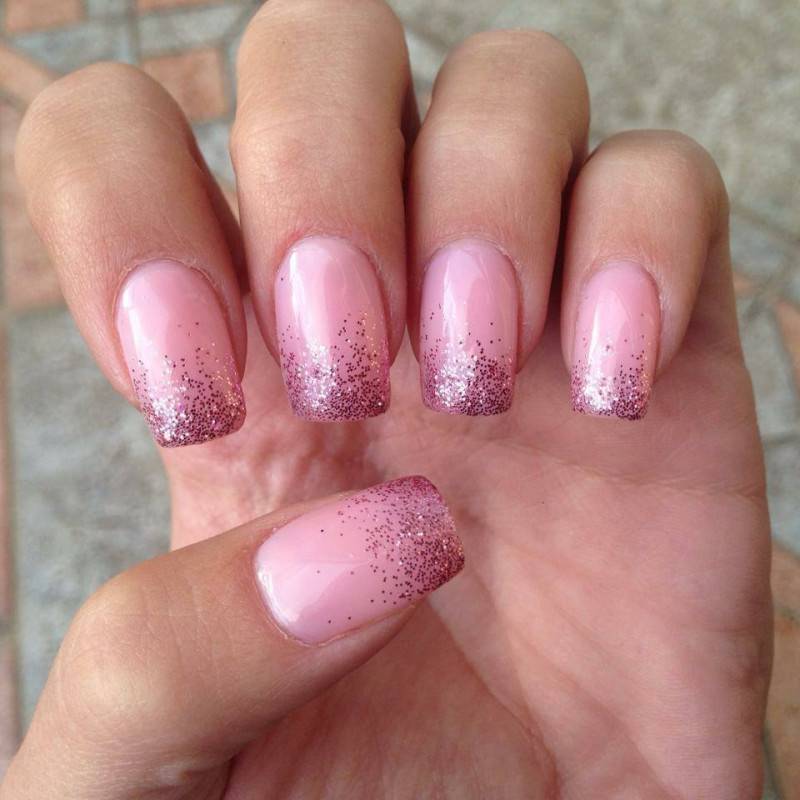Лак с мерцающими компонентами наноситься таким образом, чтобы плотность блесток на краю ногтя была высокой. Ближе к корню ногтя блестки постепенно редеют. Такой вариант часто используют на нарощенных гелевых или акриловых ногтях. Блестки уже входят в состав средства для наращивания. Этот вариант дизайна удобно также исполнять гель лаком.