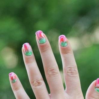Оттенки розового цвета прекрасно дополняют коралловые тона. Они подчеркивают изящность женских рук и добавляют образу больше яркости. Оттенки кораллового цвета вместе с розовым, а также незамысловатыми рисунками.
