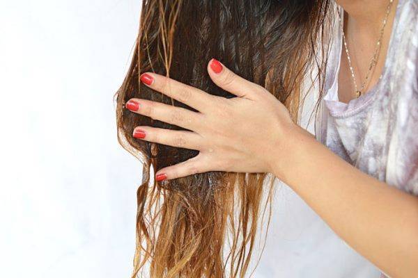 - Получившийся состав надо нанести на слегка влажные локоны. Старайтесь не затрагивать кожу головы. Поэтому стоит отступить пару сантиметров от корней.