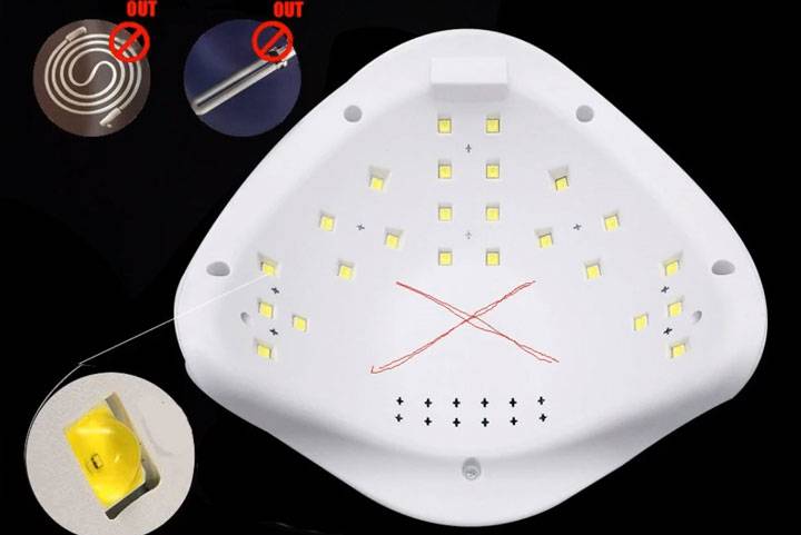 Излучающими элементами конструкции LED лампы для сушки ногтей являются светодиоды – полупроводники, преобразующие электроэнергию в световые волны. Есть существенное отличие от ультрафиолетовой: ЛЕД-лампа не требует частой замены деталей и обеспечивает до 100 тысяч часов работы. Она относится к более дорогостоящему ногтевому оборудованию.
