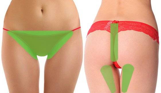 Глубокое бикини, также известное как голливудское бикини Полное удаление волос спереди и сзади интимной зоны — полная эпиляция вместе с зоной между ягодицами, которая делает зону бикини полностью гладкой.