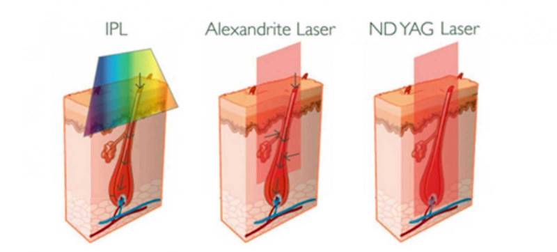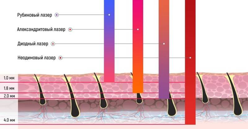 Лазеры, используемые для эпиляции, представлены в четырех вариантах. Приборы отличаются по длине волны, что влияет на глубину проникновения луча в дерму.