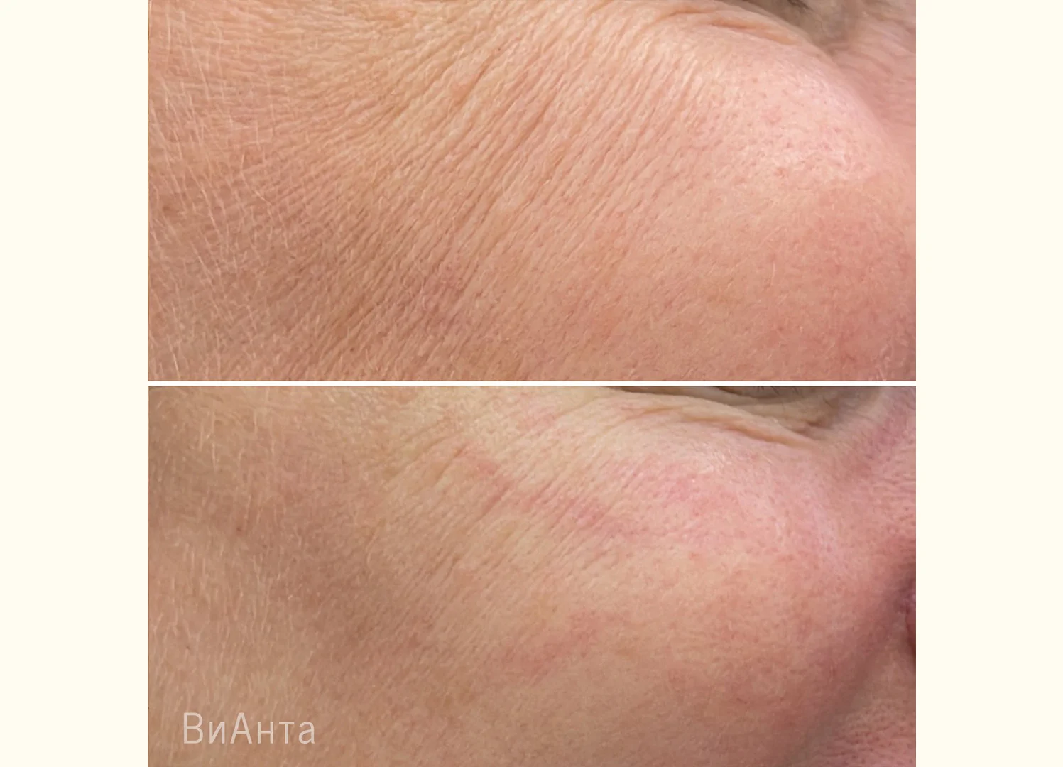 Происходит равномерный прогрев с одномоментным сокращением площади кожи – лифтинг и разглаживание. Кожа разглаживается от мелких морщин, сокращается и подтягивается, сужаются поры. Появляется глянцевость, здоровый красивый цвет, усиливается светоотражение и сияние.