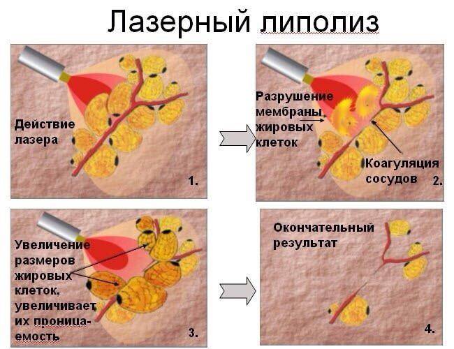 Энергия лазера позволяет разрушить мембраны адипоцитов, одновременно осуществляя коагуляцию капилляров и сосудов, которые пронизывают жировую ткань, для минимизации процесса образования гематом. В ходе температурного воздействия отмечается уплотнение волокон коллагена, кроме того, стимулируется естественная выработка эластина и коллагена. Данная процедура, по словам специалистов, позволяет достичь не только уменьшения объема жировой ткани, но и заметного эффекта кожной подтяжки в зонах проведенной обработки.