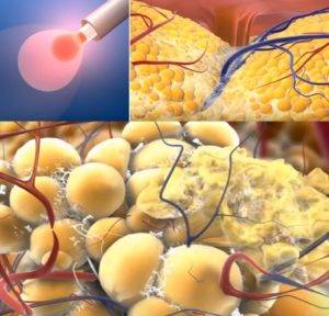 - После воздействия лазера, мембраны адипоцитов уничтожаются. В это же время происходит запайка сосудов и капилляров, что предотвращает появление гематом на теле. Коллаген и эластин вырабатываются в большем объеме.