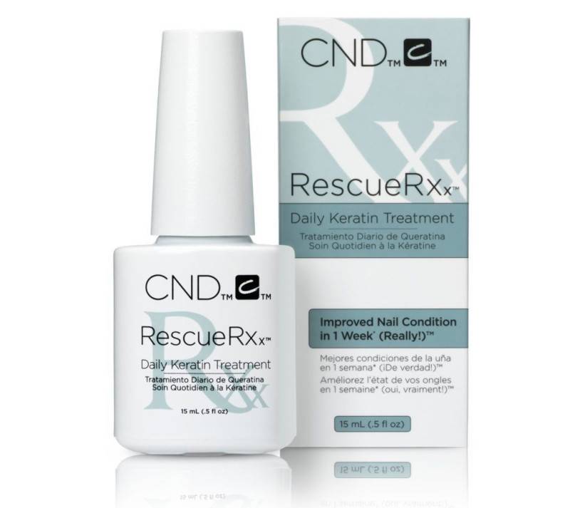 CND RescueRXx Daily Keratin Treatment – кератиновая маска, помощь ее заключается в качественном питании, увлажнении, а также она восстанавливает поврежденные и ослабленные ногти. Состав маски включает в себя масло жожоба, витамин Е и белок-кератин. Благодаря белку средство укрепляет ногти и делает их твердыми. Для получения положительного эффекта лечения использовать маску надо каждый день несколько недель. При лечении женщине надо отказаться от окрашивания ногтей декоративной косметикой. Флакончик перед применением встряхивают, маску выдерживают на ногтях в течение 10 минут, после чего остатки удаляют ватным диском.